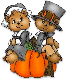 A turkey with pilgrims plus pumpkins and autumn leaves. |