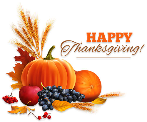 A pilgrim with harvest foods plus Happy Thanksgiving. |